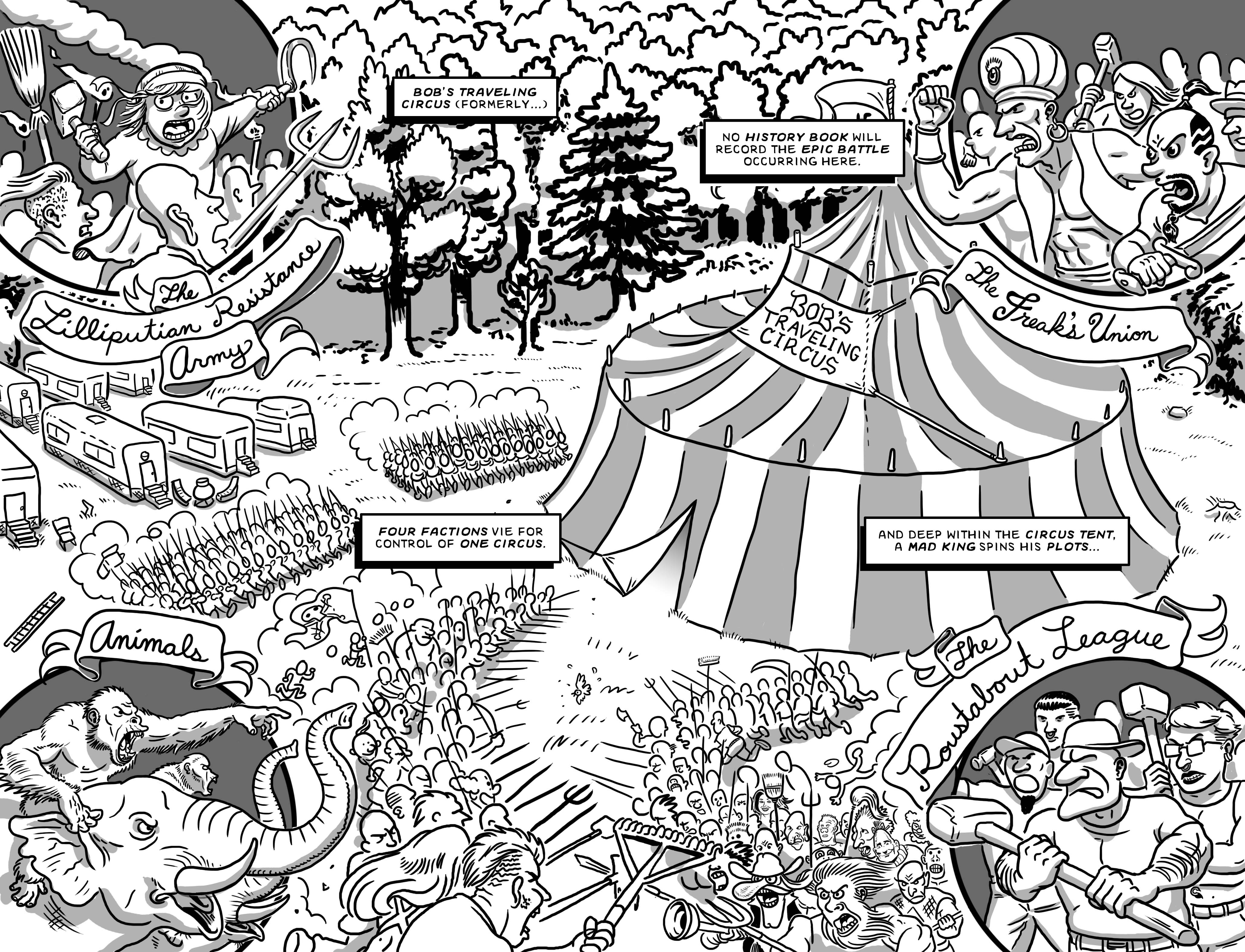 The war for Bob's Traveling Circus is coming to a cataclysmic end! Who will emerge triumphant? And what the heck is Bob doing in a hot-air balloon?! Find out in the wacky, gag-filled, bizarre issue of The Human Cannonball!!!